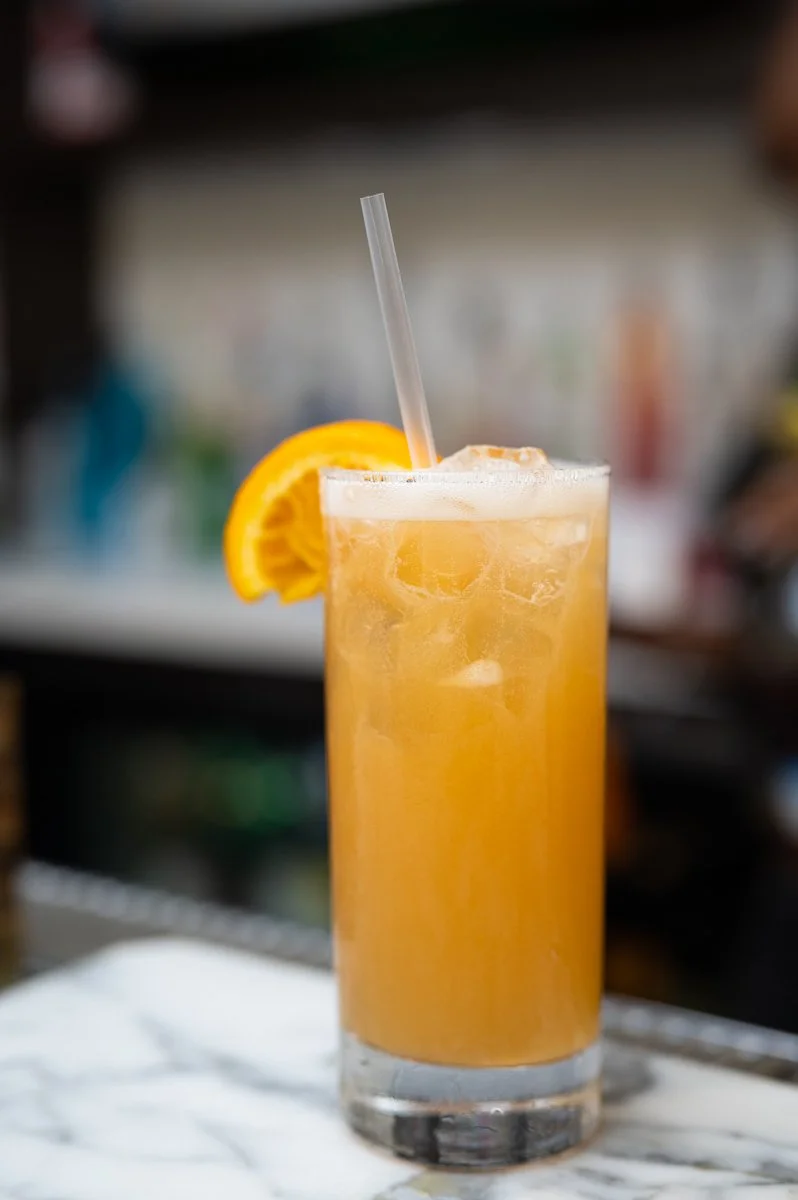 His favorite cocktail is a Mexican Firing Squad. Although this tasty treat is not on the menu, Bar Hustle is thoroughly stocked to make it and many other favorites. But I love his Benevolent Sunset. It’s made with bourbon or mezcal, pineapple juice, cherry liqueur, and ginger beer. I would recommend you sip on a Benevolent Sunset while enjoying a chill vibe during Juntao’s Sundown Sundays.