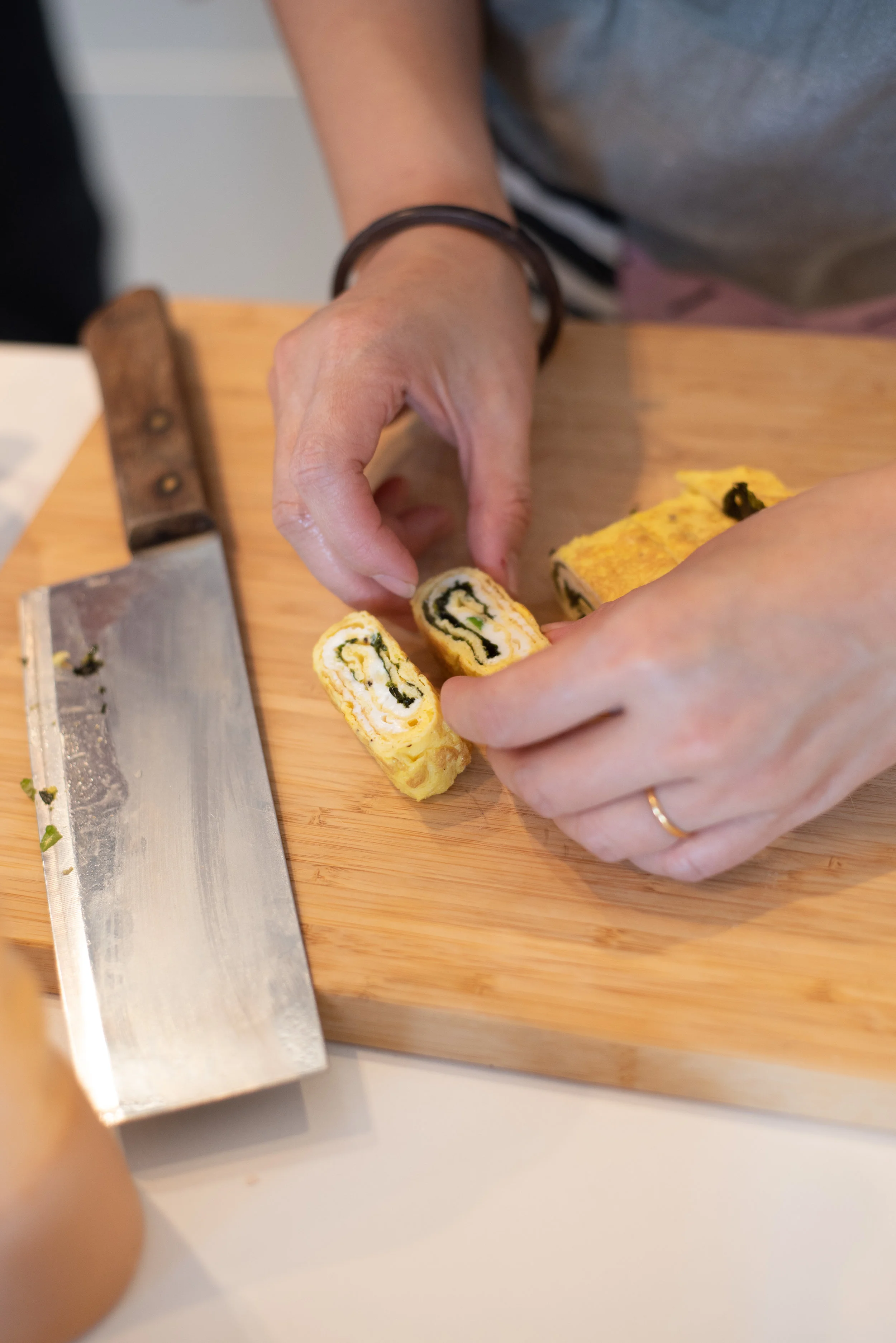 3. Using chopsticks, roll the egg and seaweed, shaping it into a log. When roll is cooked through, remove from pan, cool and slice into bite-sized pieces.