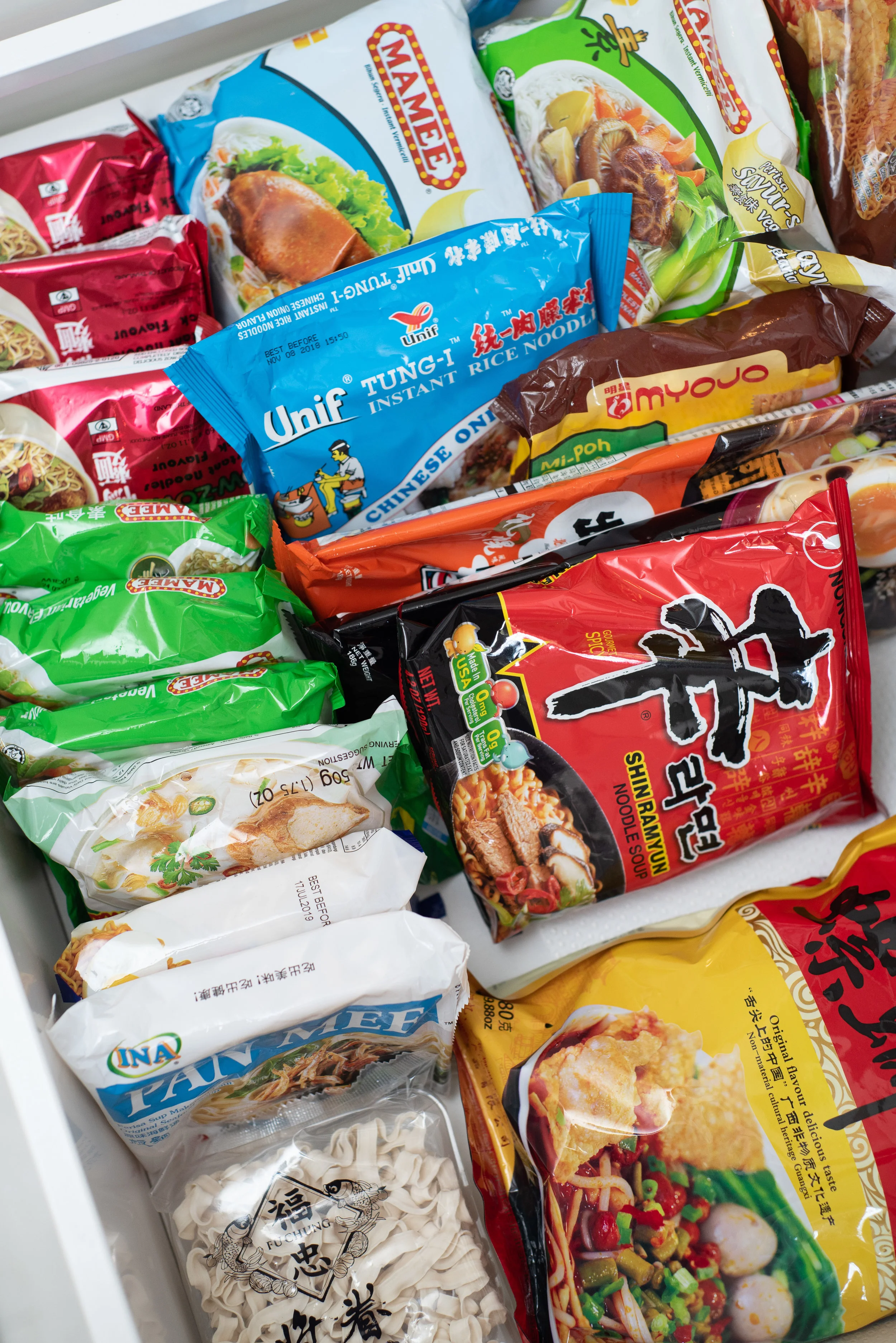 Tons of noodles, mushrooms, spices, seaweed, boxed water.