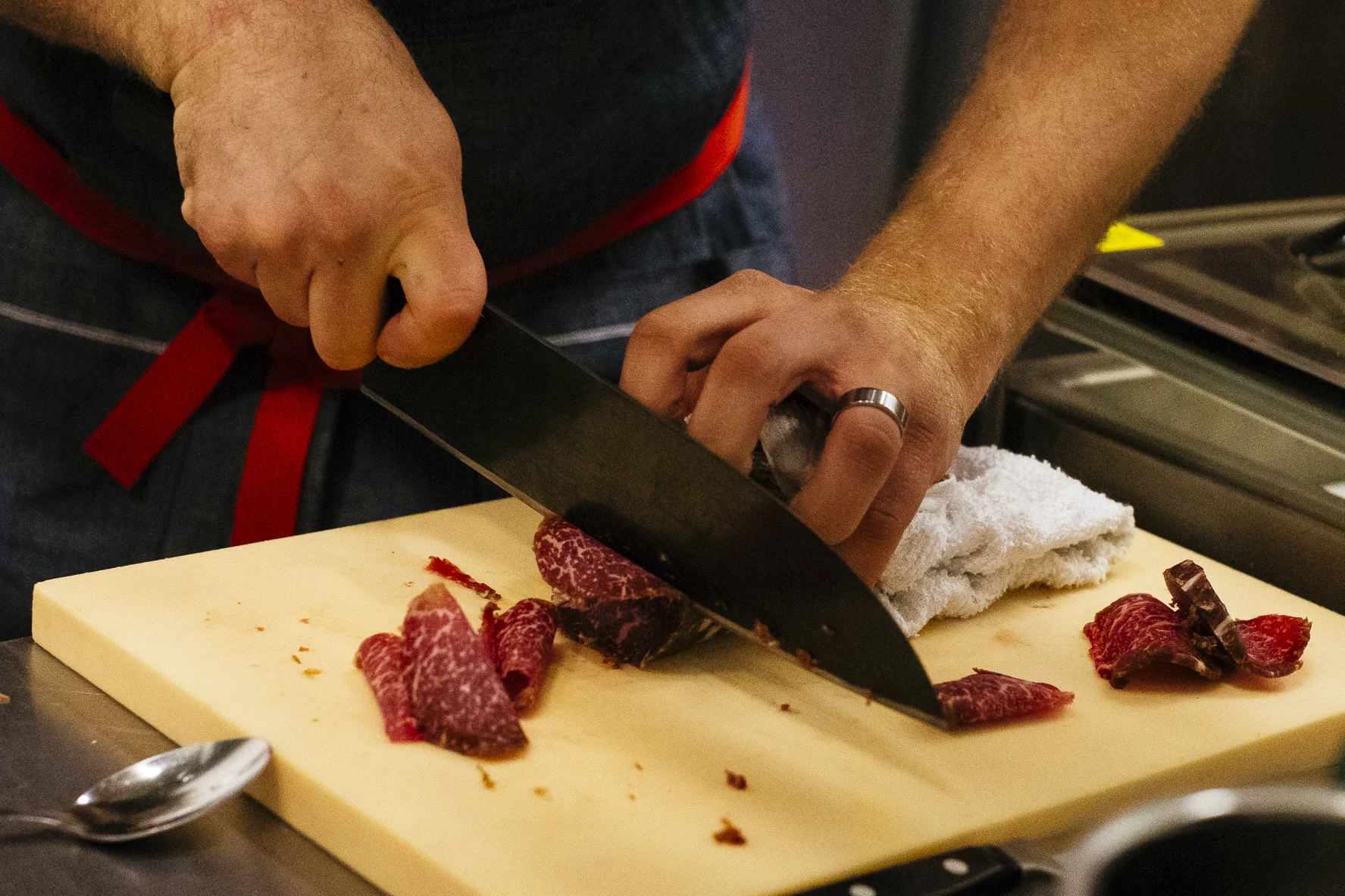 Zach describes Michael as his “right-hand man” and I note that they look like teammates in their nearly identical dark-washed denim aprons. Michael sports a man bun, in a good way, and is the most animated of the chefs in attendance. He and Zach met while working for Andrew Michael Italian Kitchen, where Michael was the lead butcher for a year. They have continued to work together at Lucky Cat, even though Michael has a side business, Happy Bear, in Little Rock where he is from. “It’s a vegan thing,” he says. “We do cakes, pop-ups and recipes on Instagram.”
